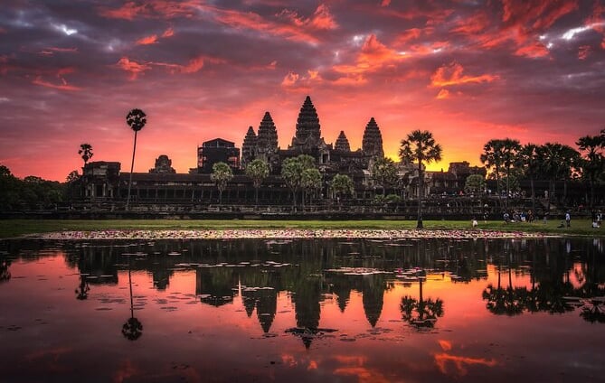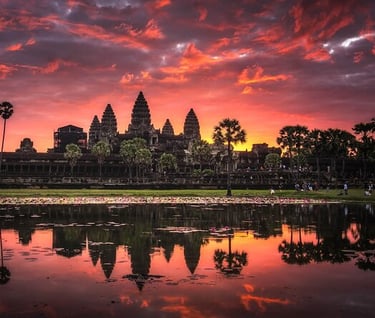 Disfruta de la salida del sol sobre Angkor Wat, el templo más emblemático de Camboya. Este es el momento perfecto para fotografías inolvidables.